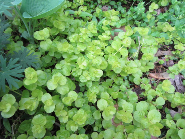 I really enjoy the way the Lysimachia nummularia ‘Goldilocks’ (Creeping Jenny) creeps around in the bed. Sometimes I accidentally pull it up when I am weeding. but I just stick it back in the soil and it continues growing like nothing happened. It is certainly a happy are carefree plant. It does creep out into the grass, but that’s OK…