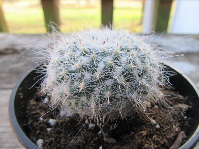 Once I came to the conclusion that it was definitely possible the two new Mammillaria were M. hahniana, I took all three plants to the back porch for a photoshoot. I brought Unos home from Wal-Mart on February 1, 2016, when it was just 1 7/8″ tall x 2 3/8″ wide. On October 15 (2020) when I moved the plants inside it measured 3 5/8″ tall x 3 5/8″ wide.