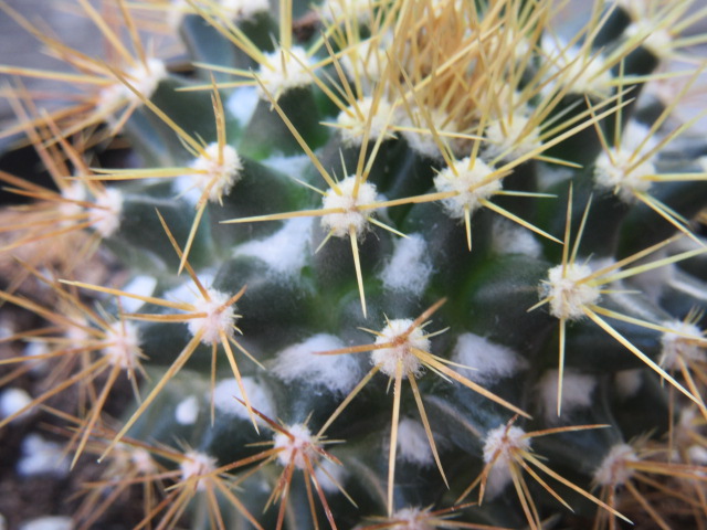 Its tubercles have wooly areoles that usually produce one central spine and 6-13 radial spines. The spines are bright yellow to dark brown and are approximately 1 1/2″ long, point away from the stem, and are VERY stiff and sharp. There is ample wool in the axils between the tubercles as well. This plant does well in sunny to partly shady areas, but bright light is supposed to bring out the bronze color, encourage flowering, and heavy wool and spine production…