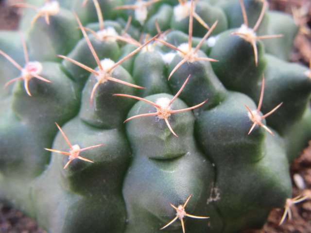 This species is rather small, growing to only 3-4″ tall x 3-5″ wide, and can be grayish-brown to blue-green, sometimes almost bluish-black. They have 9-10 rather broad ribs with prominent tubercles divided by deep axils. The areoles on the end of the tubercles have a small tuft of wool and 5-7 very short, somewhat recurved, radial spines. It looks like there is a smile between each tubercle… There is a name for that but I forgot what it… I read about that as a distinguishing feature of another species. 🙂