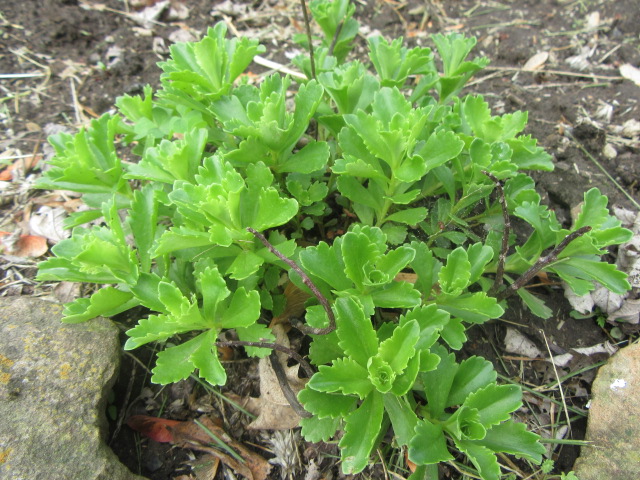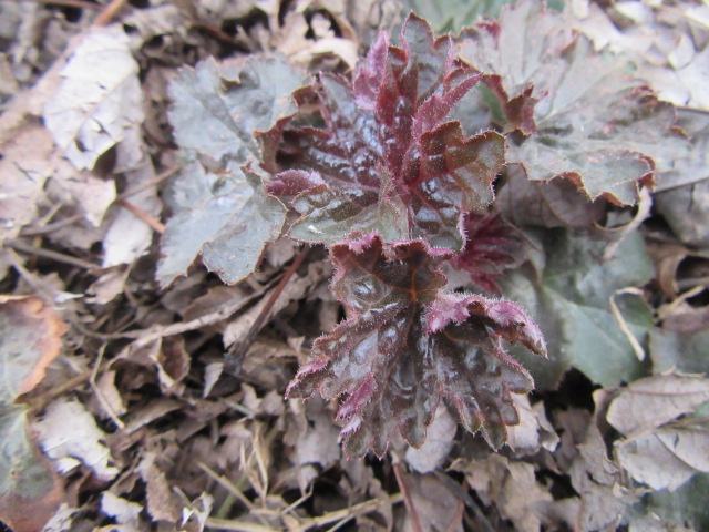 The Heuchera ‘Palace Purple’ (Coral Bells) is off to a good start with a few new leaves. Coral Bells are great plants that come in a wide variety of leaf colors. They prefer a fairly shady spot, although there are new cultivars that will grow in full sun.
