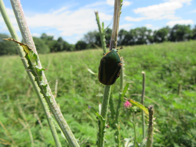 I found a good-sized group of Bull Thistle I had somehow overlooked right in the middle of a large area. When I was getting ready to spray, the plants came to life as these HUGE beetles started flying out. It was very hot, so apparently, the beetles were farther down inside the thistles. I couldn’t get any photos at first because the beetles were moving pretty fast. Then, several feet away, I noticed this beetle along with a Japanese Beetle on a stem of an old Musk Thistle.