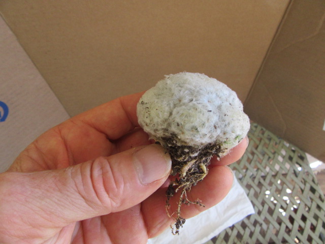 OK, in layman’s terms… I looked at the plant closely with a magnifying glass and it was still fairly difficult to see what is going on because everything is so small. The tubercles are fairly close together so the radial spines kind of interlace with each other. The radial spines, even though Llifle says they are 1-7 mm long, some of them measured 1/8″ long and are pretty stiff. Even though they are thin and stringy looking, they are more like a very thin wire. Very few resemble feathers, BUT if you look closely at the above photo you can actually see a few in this photo that does look like feathers… It is hard to tell where the hair (trichomes) comes from but Llifle says the spine axis. That would mean also from the areole since that is where the spines grow from. The wooliest areas are around the apex and feel like cotton. Oh yeah… The brown spots in the photo are the centers of the areoles. It is going to be neat watching this plant grow.