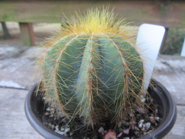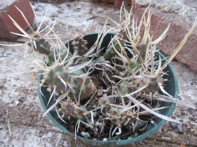 The other plant I brought home from Lowe’s on November 10 might be a Polaskia chichipe. At least that is what a member of Succulent Infatuation suggested. I am not 100% sure because the plants in this pot have 7 ribs while information on LLIFLE and other sites say they are supposed to have 9-12. HOWEVER, when checking images online, many had as few as 6 ribs. HMMMM… Some sites say the species has 9-12 ribs while they show photos of plants with 6. 🙂 I think they buy plants to sell and think it is one species and might be another. Who know since so many look so much alike. I sent photos to Daiv Freeman of the CactiGuide and SucculentGuide to see what he thinks…