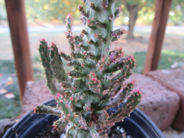 When I brought this plant home it was 4 3/4″ tall x 2 1/4″ wide. On October 15 when I moved the plants inside, it was still 2 1/4″ wide, but it had grown to 6 1/4″ tall. The lower, um, branches or whatever is sticking out all over it, have gotten longer and flatter.