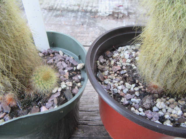 Something strange happened over the summer with the two Parodia lenninghausii (Golden Ball Cactus). I always called them “Greater” and “Lesser” because one was always tall than the other. Yeah, I know, I named the two Echinocactus grusonii (now Kroenleinia grusonii) “Greater” and “Lessor” because of the same reasons. The same thing happened with these two that happened with the other two. They are both the same size now! “Greater” on the right was always taller and thinner but they are both 6″ tall x 2 3/8″ wide now. Last October 11, “Greater” was 5 3/4″ tall x 2 1/4″ wide, and “Lessor” was 5 1/2″ tall x 2 3/4″ wide. Weird! I brought these two home with me from Wal-Mart on February 1, 2016, and I didn’t realize I had two until I got home (the same as with the Echinocactus/Kroenleinia grusonii…). I forgot to measure “Greater” at the time, but “Lesser” was only 1 7/8″ tall x 1 3/4″ wide. SO, they have grown A LOT!