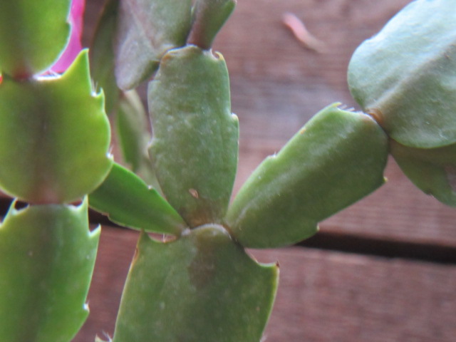 Schlumbergera species have leafless stems called cladodes that act as photosynthetic organs. The cladodes are made up of flat segments that have 2-3 teeth along their edges and ends. The species gets its scientific name, “truncata” from the word “truncated” meaning “cut off” or “abruptly cut off” because the tips look cut off rather than being round or pointed. The areola between the two teeth on the ends have brown wool and bristles and is where the flowers and new segments appear.