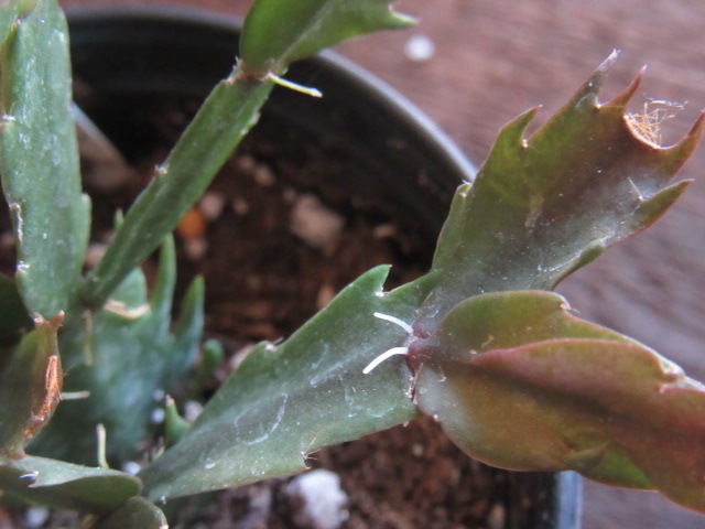 I never noticed the brown wool before, but the red one is quite wooly between the teeth at the tip. The red one also has darker segments and over the summer the whole plant was a shade of reddish-brown. Now it has these weird little aerial roots.