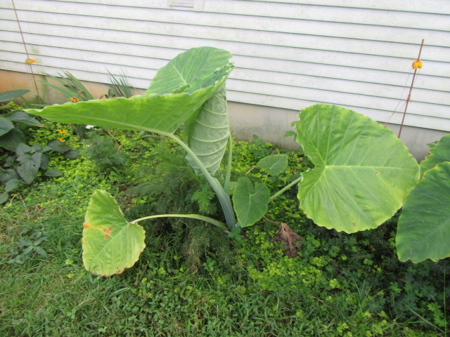Hmmm… While I am sure this is a Leucocasia gigantea ‘Thailand Giant’ this year, it seems it should be much bigger. I am not sure how tall this one is, but the previous one was 54″ tall on 8-29-17. If you remember, the one I bought last spring turned out to be a Xsanthosoma robustum… The Leococasia gigantea ‘Thailand Giant’ I had in 2017 grew HUGE but it was closer to the porch where the soil is better. Maybe a little of Mrs. Wagler’s fertilizer is on order. I was reserving the space closer to the porch for the Xanthosoma sagittifolium a friend was supposed to send me but it never arrived. The X. robustum from last year rotted. I had plans for this bed but…