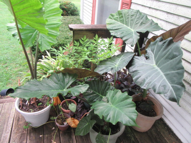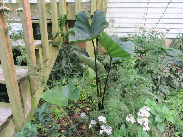 The Colocasia esculenta are doing great as always even though not as large as usual. The top part of the rhizomes rotted before I set them out, which never happened before. As a result, I have many offsets with no main plant.