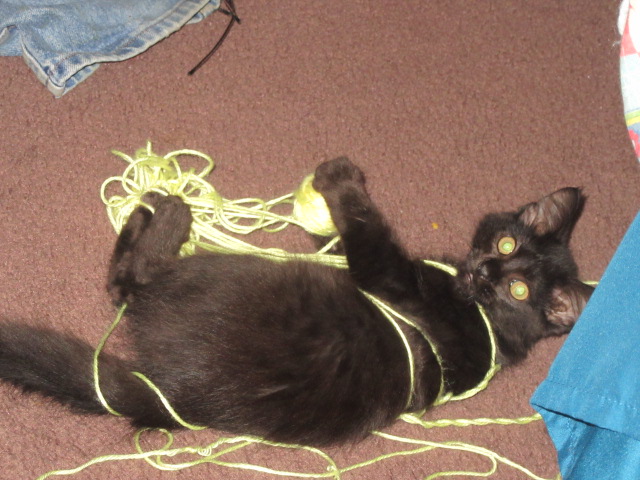 She has been here several weeks now and last week I let her in the rest of the house. Jade, Nathans female cat, didn’t approve at first and would run from her. Simba, his male cat, has been staying outside. When he first saw her, she was in the hallway and he was in the kitchen watching her. He started talking to her and the kitten came into the kitchen. Simba just watched her and the kitten eventually came up to him. They smelled noses and neither one of them hissed or growled. The problem is, Simba is quite interested in her and would really like to play but he is very big… Once the kitten gets bigger, that may be OK… One of them is going to have to go to the vet, though. 🙂