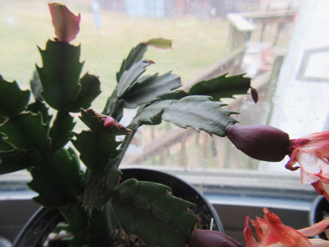 The new Schlumbergera gaertneri (Easter Cactus), also on the kitchen windowsill, is doing well and its new segments are starting to grow. They looked a little strange at first because they were almost black…