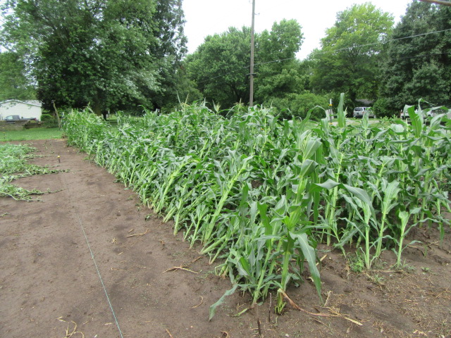 I commented to a few people in town about the corn blowing over and they said, of course, “It will stand back up.” OK, that may be true in some cases but not always. In the past, I have been very surprised that it has stood back up on its own but that was when it hadn’t blown over that much. It was more or less leaning a little but not severely blown over. I have grown corn enough over the years to know even if corn does stand back up it will not be perfectly straight like it was before it blew over. It will curve upward just like most other plants do and look weird… Who wants weird corn? I knew I needed to get in the there and straighten it back up before it started its curving, and trust me, it starts doing that sooner than you would expect. You can’t wait to see if it stands back up on its own for a few days…
