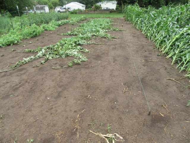For those of you who didn’t see it on the Wordless Wednesday post, the above photo is what I woke up to Wednesday morning. Sometime in the morning, maybe around 4-5 AM, I heard it thundering and then the wind picked up. Then it started pouring. The forecast had said 30% chance of rain, less than one-tenth of an inch with higher amounts possible during thunderstorms. When I heard the wind I thought, “the corn will blow over.” I hadn’ slept a wink hardly until it started raining but it put me to sleep. I got up, not telling when, made coffee, fed the cats, and checked the rain gauge. There was 2″. I didn’t look toward the garden because I really didn’t want to see it until I was more awake.