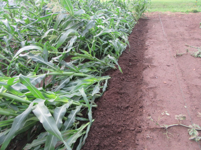 The two rows closest to the fence had been hilled within the past week. Normally, it would have already been hilled up but some of the corn was still fairly small. Then we got a little rain a couple of times and it really shot up…